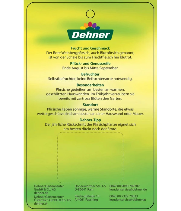 Der ‚Rote Weinbergpfirsich‘ bevorzugt einen sonnigen und warmen Standort, welcher etwas windgeschützt sein sollte. Der Boden soll nahrhaft und leicht sein. Auf schweren Böden treibt der Baum im Herbst zu lange und wird so anfälliger für Frost. Vergessen Sie nicht die Pflanze zu düngen und zu gießen, um gute Erträge zu erzielen. Der Pfirsich ist eine selbstbefruchtende Pflanze, benötigt also keinen extra Befruchter. Ein wichtiger Hinweis für Sie ist noch, dass die Schale der Frucht sehr fest und pelzig ist. Der Pfirsich sollte vor dem Verzehr geschält werden.