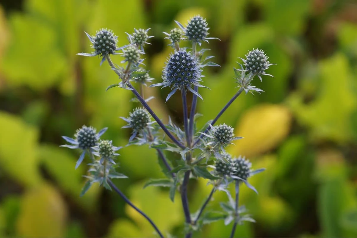 Der Flachblättrige Mannstreu (Eryngium planum) fällt durch seine blauen und stacheligen Blüten auf. Er wächst aufrecht und trägt ballförmige Blüten mit dornig gezähnten Blatträndern. Seine Blüten dienen als Nahrungsquelle für Bienen und zahlreiche andere Insekten.