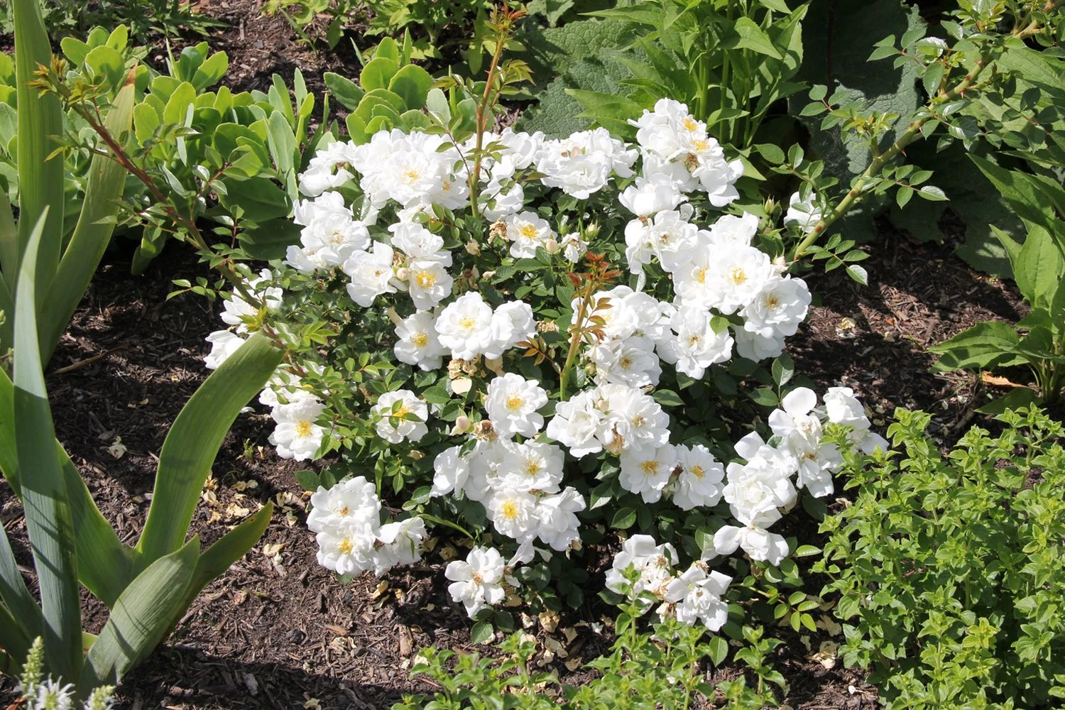 Die Rose ‚Bienenweide‘ in weiß besitzt schneeweiße halb gefüllte Blüten und intensiv gelbe Staubgefäße. Sie ist öfterblühend und hat einen kompakten Wuchs.