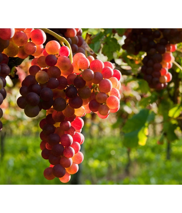 Wenn im Herbst die roten Trauben zwischen dem grünen Laub zum Nähertreten verlocken, dürfen Sie dieser Versuchung ruhig nachgeben und sich die großen, ovalen, knackigen Trauben Ihrer eigenen Weinrebe auch mal frisch vom Strauch schmecken lassen. Die fruchtige Süße mit der erfrischenden Säurenote sind Beere für Beere ein kulinarisches Erlebnis! Bei dem Wein ‘Katharina‘ handelt es sich um eine hochwertige Rebe aus deutscher Züchtung, dessen Sortenschutzinhaber Jörg Wolf aus Bad Dürkheim-Ungestein ist. Die kräftige Pflanze überzeugt auch mit guter Frosthärte und einer guten Toleranz gegen Pilzkrankheiten. Setzen Sie jetzt den Wein ‘Katharina‘ in Ihren Garten und Sie werden die kommenden Jahre aus mehr als einem Grund froh über diese Entscheidung sein. Denn neben den erlesenen Weinbeeren, die jeden Gourmet begeistern, wird auch der Anblick Ihrer prächtigen Weinrebe mit dem üppigen Blattschmuck Ihr Gärtner-Herz höherschlagen lassen. Auch nach der Ernte, wenn die Blätter des Weins einen weithin leuchtenden Blickfang im Herbstgarten bilden.